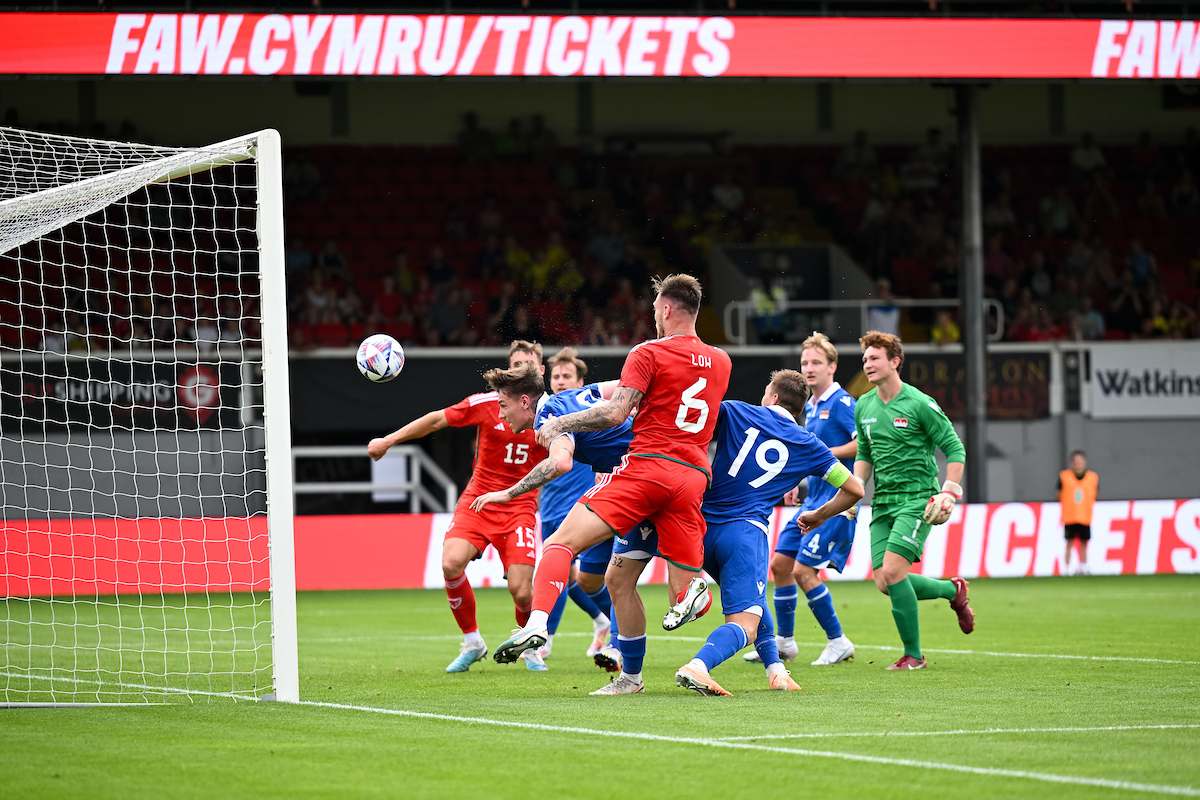 Joe Low puts Cymru ahead when he meets a cross from the right at the back post. Cymru deserve their lead.