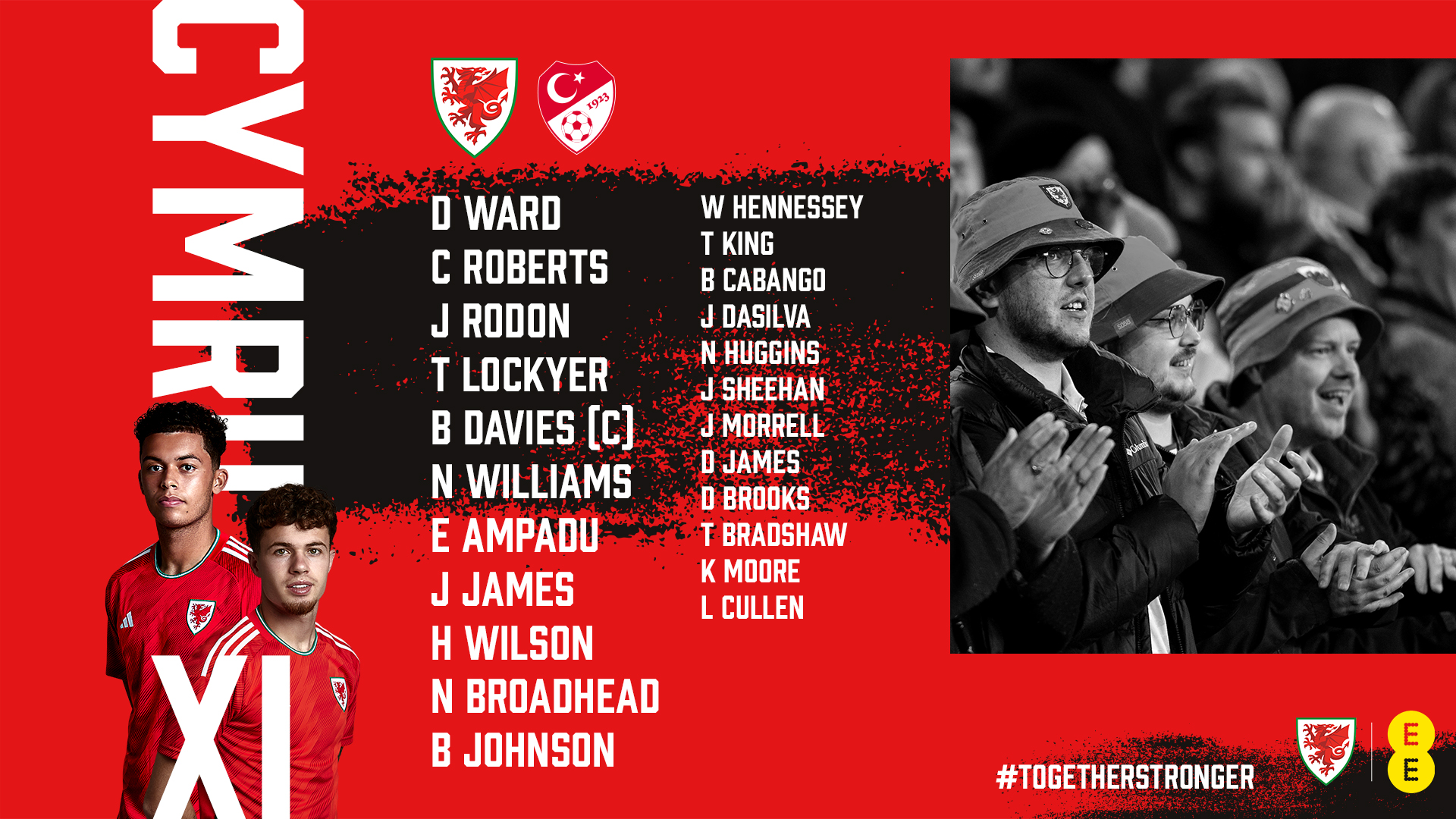 Cymru have made three changes to their starting XI with Tom Lockyer replacing Chris Mepham (suspended) in defence, Nathan Broadhead is preferred up front instead of Kieffer Moore and David Brooks makes way for Brennan Johnson.