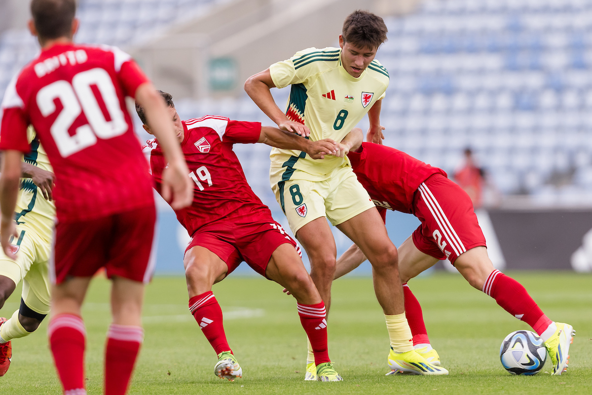 Rubin Colwill gets some close attention from the Gibraltar midfield.