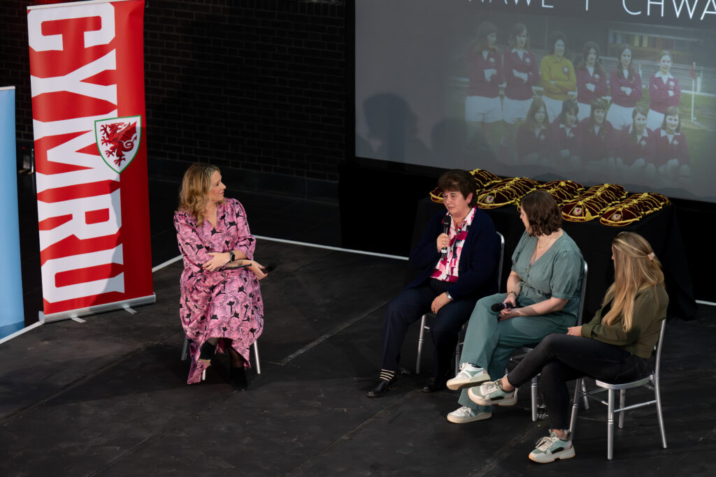 The first panel looked back at the history of the women’s game in Wales, featuring former player Michele Adams; Former Head of Women and Girls’ football at the FAW, Lowri Roberts; and Hawl i Chwarae documentary presenter, Ffion Eluned Owen.