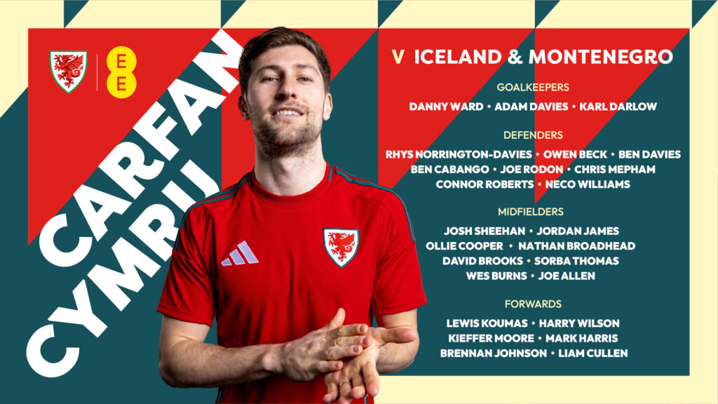 Cymru: Danny WARD (Leicester City), Adam DAVIES (Sheffield United), Karl DARLOW (Leeds United), Rhys NORRINGTON-DAVIES (Sheffield United), Owen BECK (Blackburn Rovers- On loan from Liverpool), Ben DAVIES (Tottenham Hotspur), Ben CABANGO (Swansea City), Joe RODON (Leeds United), Chris MEPHAM (Sunderland- On loan from Bournemouth), Connor ROBERTS (Burnley), Neco WILLIAMS (Nottingham Forest), Josh SHEEHAN (Bolton Wanderers), Jordan JAMES (Stade Rennais), Joe ALLEN (Swansea City), Ollie COOPER (Swansea City), Sorba THOMAS (Nantes- On loan from Huddersfield), Wes BURNS (Ipswich Town), Nathan BROADHEAD (Ipswich Town), David BROOKS (Bournemouth), Brennan JOHNSON (Tottenham Hotspur), Harry WILSON (Fulham), Kieffer MOORE (Sheffield United), Mark HARRIS (Oxford United), Lewis KOUMAS (Stoke City- On loan from Liverpool), Liam CULLEN (Swansea City).