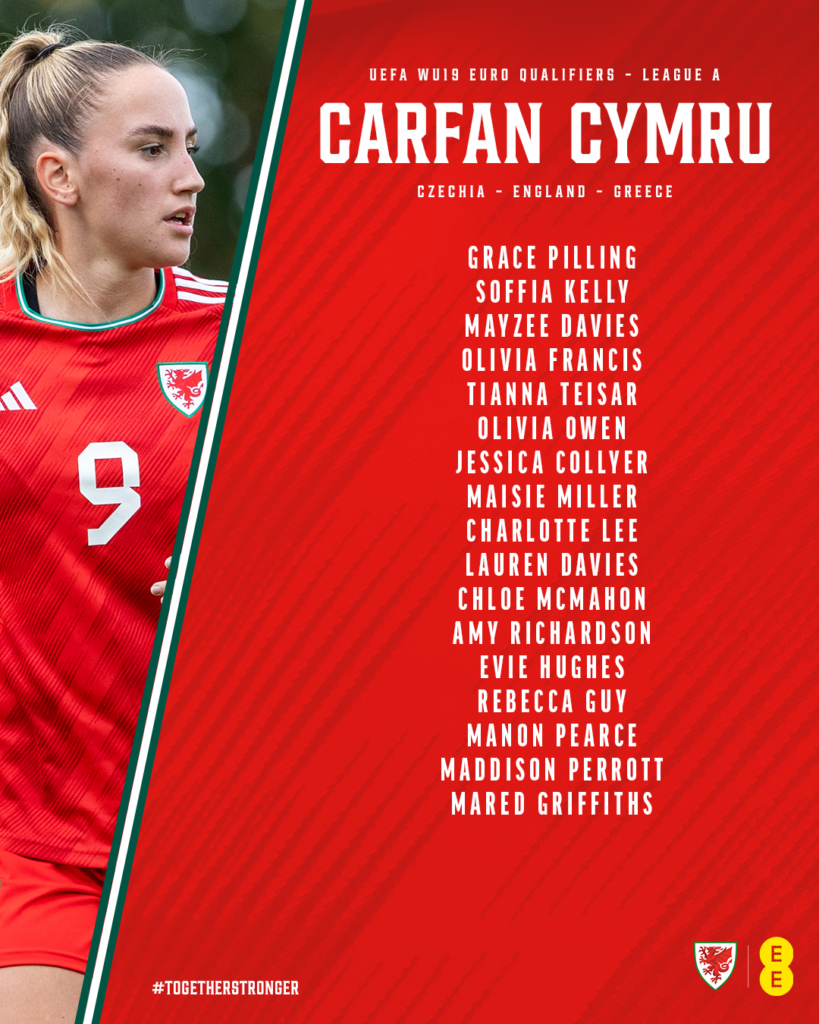 Cymru WU19: Grace PILLING (Blackburn Rovers – Dual signed with AFC Fylde), Soffia KELLY (FAW South Girls Academy), Mayzee DAVIES (Manchester United), Olivia FRANCIS (Manchester United), Tianna TEISAR (Bristol City), Olivia OWEN (West Bromwich Albion – Dual signed with Sporting Khalsa), Jessica COLLYER (Loughborough Lightning), Maisie MILLER (Durham), Charlotte LEE (Aston Villa), Lauren DAVIES (FAW South Girls Academy), Chloe MCMAHON (FAW South Girls Academy), Amy RICHARDSON (Everton – Dual signed with Liverpool Feds), Evie HUGHES (FAW South Girls Academy), Rebecca GUY (Everton – Dual signed with Liverpool Feds), Manon PEARCE (Bristol City), Maddison PERROTT (Bristol City), Mared GRIFFITHS (FAW North Girls Academy).