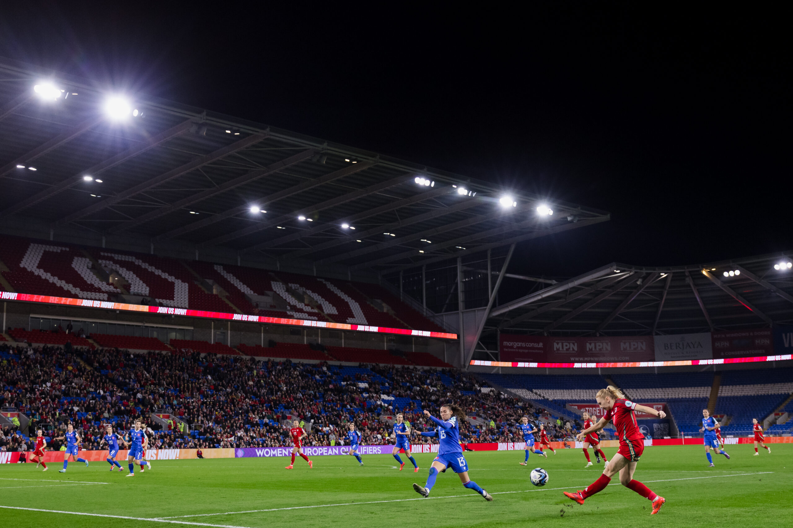 Pre-match in the stadium bowl: Stadium lightshow, Zombie Nation, National Anthem & Cymru Playlist.